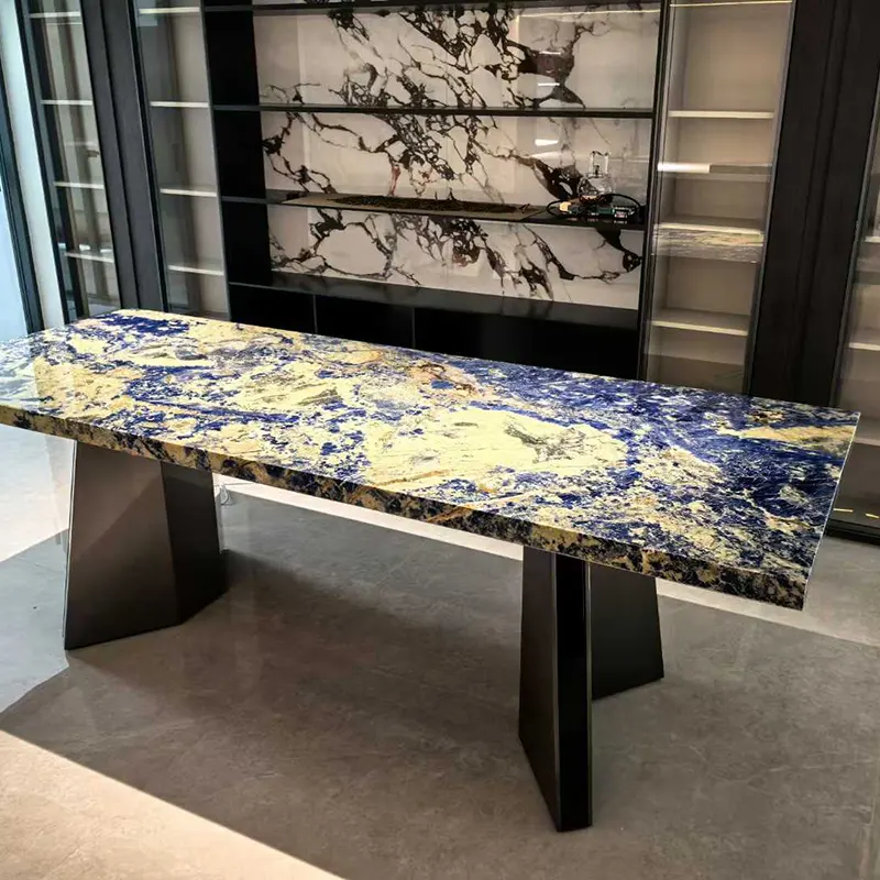 O granito é único na indústria de decoração em casa devido ao seu processo de resfriamento lento. O granito azul da Bolívia, uma pedra impressionante da Bolívia, é um país da América do Sul que mina sodalita azul. Sua tonalidade cinza-cinza serena e linhas de sodalita escura são impressionantes. Cada laje é única, semelhante às montanhas dos Andes. Com sua dureza e resistência supremos, ele pode suportar o uso diário sem problemas.